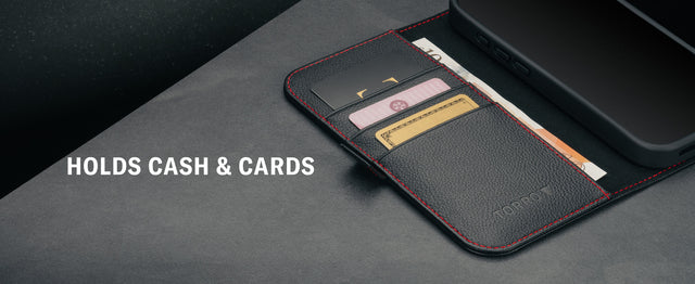 The iPhone 17 case features an integrated stand function facilitating horizontal screen viewing. The case also features three credit card slots as well as a compartment for money. The iPhone 17 cover features a secure closure with the side clasp magnetising to a discreet hidden magnet embedded within the frame..