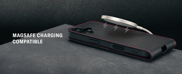 The leather flip case for iPhone 17 has been designed to be compatible with the official MagSafe Chargers. MagSafe charging requires a plug with minimum 20W output (27W is recommended for the Duo MagSafe Charger). We cannot guarantee compatibility with other MagSafe accessories. The case will not be suitable for use with vertical MagSafe stands, in-car MagSafe chargers, etc.