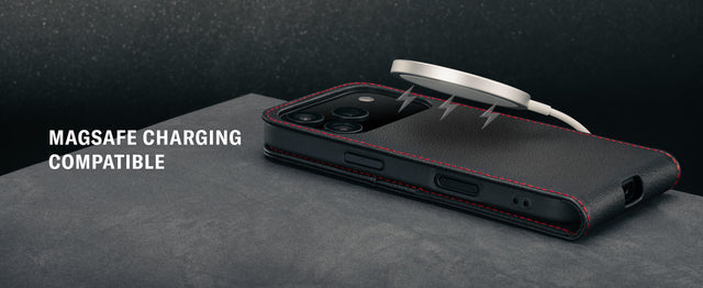 The leather flip case for iPhone 17 Pro Max has been designed to be compatible with the official MagSafe Chargers. MagSafe charging requires a plug with minimum 20W output (27W is recommended for the Duo MagSafe Charger). We cannot guarantee compatibility with other MagSafe accessories. The case will not be suitable for use with vertical MagSafe stands, in-car MagSafe chargers, etc.